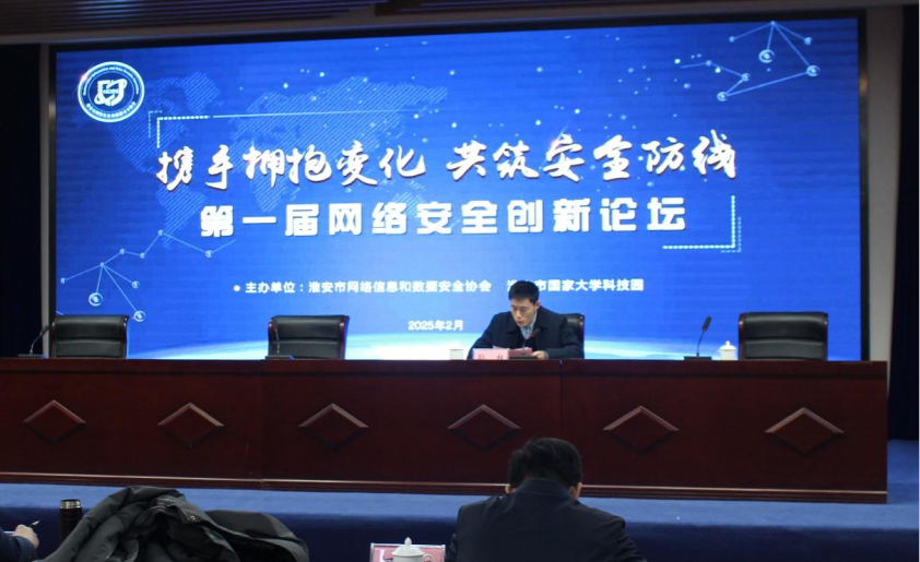 2025年2月27日,淮安市网络信息和数据安全协会会同淮安市国家大学科技园在淮安智慧谷会议中心举办第一届网络安全创新论坛。协会会长、淮安易云科技有限公司董事长朱峰平,协会驻会副会长、淮阴工学院原副校长陆为群,协会秘书长、市委网信办网络安全应急指挥中心主任孙权,协会党建指导员、市委网信办网安处副处长何权,淮安市国家大学科技园总经理刘刚等领导和嘉宾出席论坛。论坛由协会秘书长孙权主持。