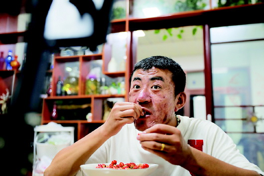 “没有啥别的才艺吸引人,就靠拼命。”匡立想对记者说,他的牙龈因此烫伤,甚至还烫掉了一颗牙。