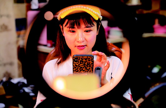 “菲菲姐”刘菲菲在家中直播。(2020年6月9日摄)