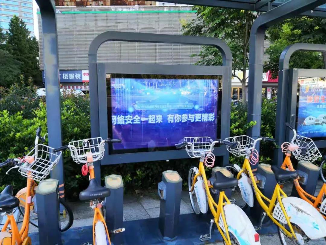 市城建控股集团充分利用公共自行车站点服务亭电子显示屏、车棚宣传栏、公众号等资源,以人民群众通俗易懂、喜闻乐见的形式,在全市27个公共自行车服务亭电子显示屏上24小时滚动播放网络安全宣传标语,同时围绕国家网络安全宣传主题,设计制作网络安全宣传公益广告,挑选出居民小区、公交换乘站及商贸中心等骑行热门站点,安装网络安全公益广告40面,并在学校、公园、景点、车站等人流聚集区域的公共自行车站点横挂网络安全宣传标语条幅10面,全方位多渠道展现网络安全公益宣传,实现网络安全公益广告遍布港城大街小巷,有效引导广大市民群众共同参与,共筑网络安全防线。