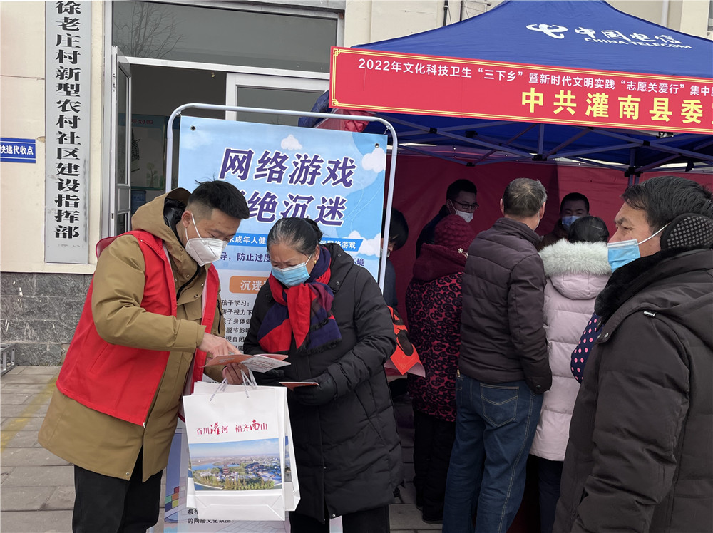 “三下乡,赶大集”。以县区文化科技卫生“三下乡”活动为契机,组织网络文明志愿者到乡镇、村居开展预防未成年人网络沉迷宣传活动。发放倡议书、网络安全知识宣传手册和网信普法宣传单等,向广大群众特别是未成年人讲解如何正确使用网络、网络安全的相关法律法规和网络安全防范措施等知识,将网络文明融入乡村年俗,为村民们带来别具风味的新年大集。