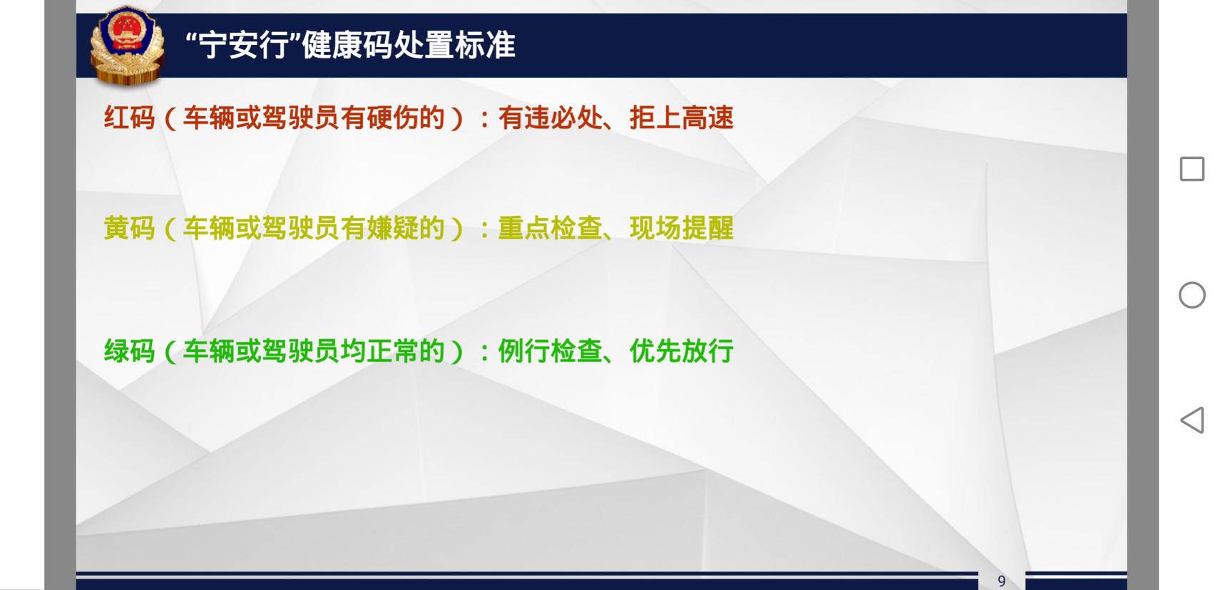 该项工作充分利用信息手段、公安交通联合行动、依托“宁安行”APP,通过公安“六合一”平台、运政在线系统数据碰撞以及动态监控交通违法信息比对,建立评价体系,形成“健康码”。实现“绿码”快速过检、“黄码”自动生成警告通知书、“红码”重点检查处置的目标,切断违规营运车辆进入主城区的通道,有效提升“两客一危”检查的针对性和覆盖面,净化路网环境,维护道路运输市场秩序、全力打造“两客一危”风险隐患的护城河防线。