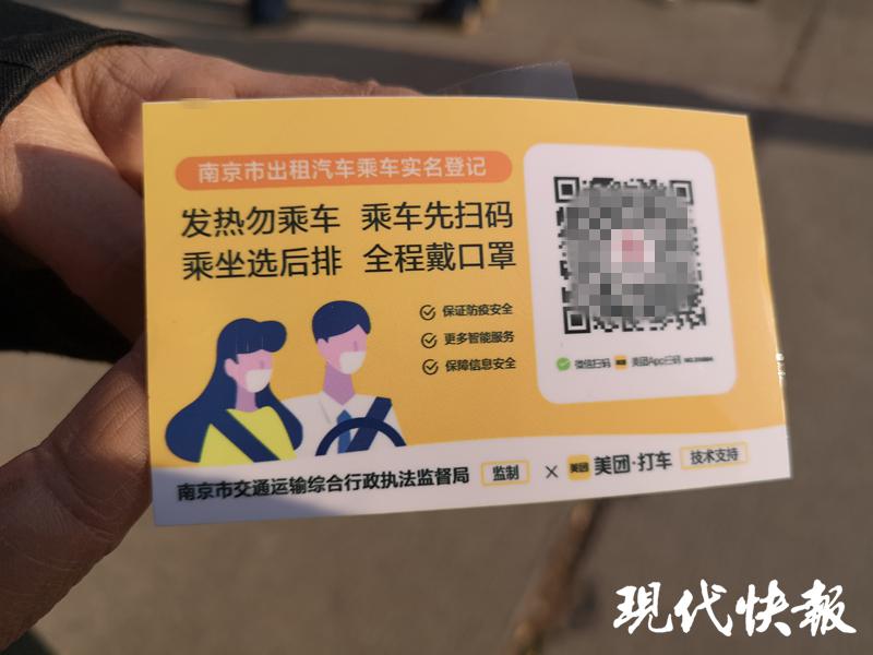 据介绍,为便于新冠肺炎疫情跟踪溯源管理,南京市交通综合执法局延续 2020年2月份乘客乘坐出租汽车扫码进行实名登记的办法,要求自本周起,南京市市域经营权出租汽车的后排窗口位置开始张贴行程信息采集二维码,对乘客乘坐出租汽车的出行信息进行扫码采集。