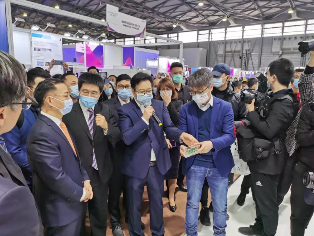 赵涤燹教授向工信部副部长刘烈宏、中国联通副总经理买彦州及中国联通研究院副院长迟永生介绍毫米波芯片