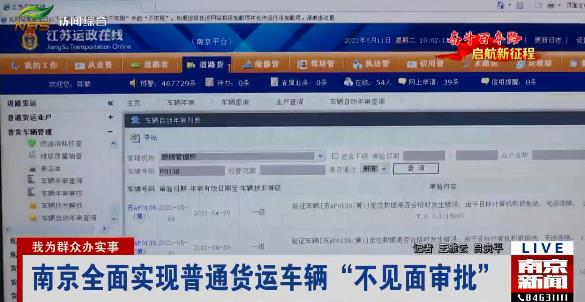 从5月10日起,南京市交通执法局推出“我为群众办实事”系列举措,全面实现货运车辆“不见面审批”。南京市内普通货运车辆办理年审,申请人只需在线提交年审材料,审核通过后,即可领取《道路运输证》电子证照。