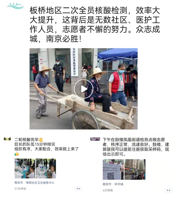 志愿者的奉献,洋溢着满满的感染力。前来核酸检测后主动请缨留下帮忙的志愿者郭晓波,听闻社区缺志愿者带领母亲一同投入防疫工作中的00后大学生党员胡恒佳……他们是三天汇聚超十万人的“志愿红”,他们以自己的行动守护“大蓝鲸”。他们的甘于奉献也感染了更多人加入到这场没有硝烟的疫情防控阻击战当中。做完核酸的小朋友给医护人员竖起大拇指,社区的阿姨端来自家热腾腾的饭菜,超市老板拿出店里的矿泉水,无数平凡人用行动展现独属于南京的温暖。