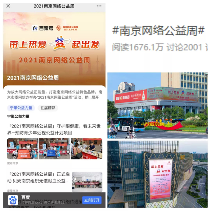 公益周活动期间,百度、微博、支付宝等平台专题和网络媒体、自媒体、网络公益专委会媒体成员对网络公益周系列活动轮播展示。网友市民不仅在全市主要公交站台、户外大屏、出租车灯箱、公共场所感受公益潮,还通过在线观看开幕快闪视频、参观网络公益项目3D云展馆、参与#南京网络公益周#微博话题,共同加入这场精彩纷呈的公益嘉年华。