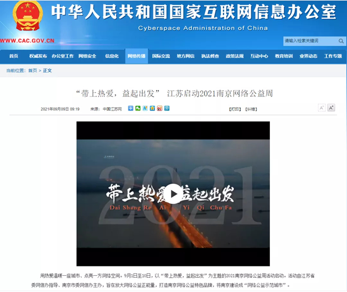活动开幕获中央网信办网站刊文《“带上热爱,益起出发” 江苏启动2021南京网络公益周》报道。
