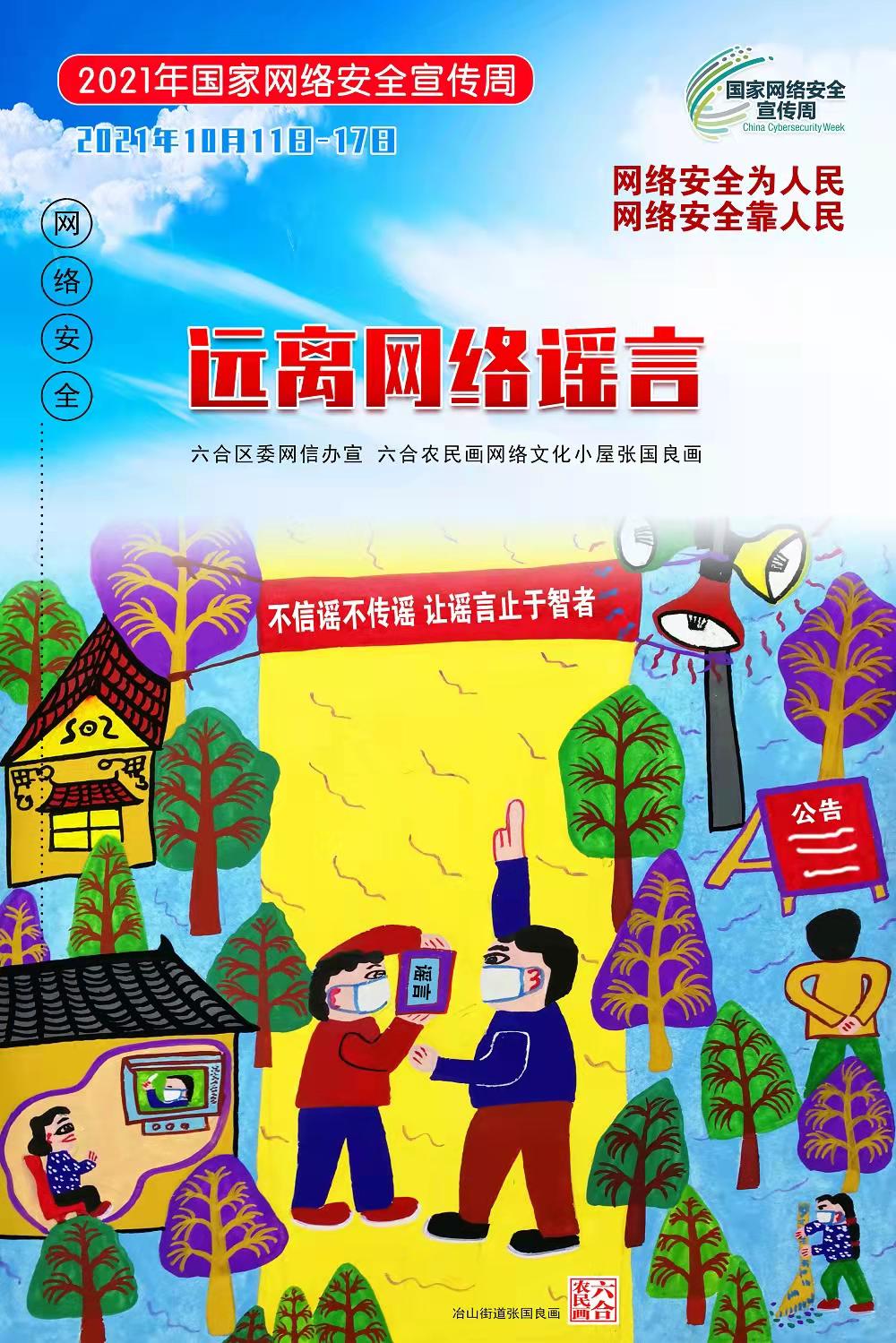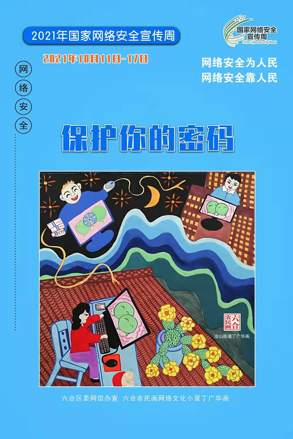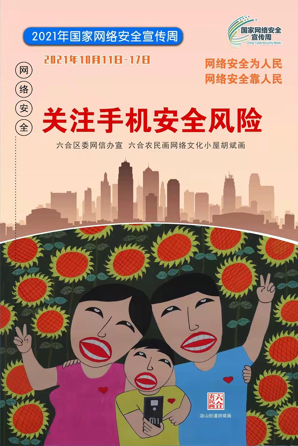 在2021年国家网络安全宣传周来临之际,六合农民画非遗传承人、六合农民画网络文化小屋的网络文明志愿者们纷纷拿起手中画笔,创作网络安全主题作品,以“微创新+接地气”的全媒体海报形式,普及网络安全知识,增强广大人民群众网络安全意识,营造了“网络安全为人民,网络安全靠人民”的良好社会氛围。
