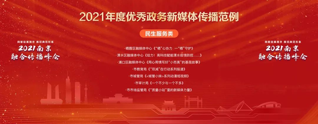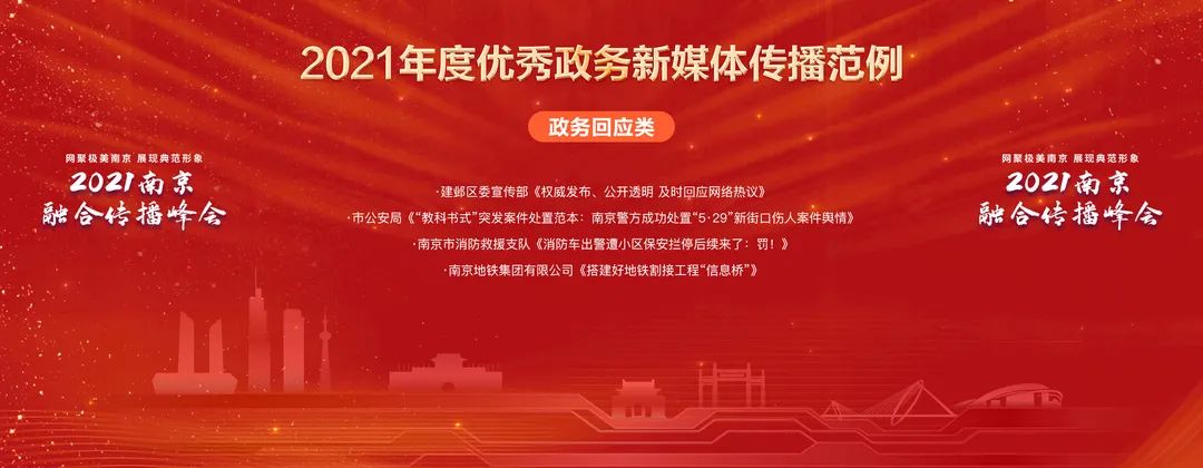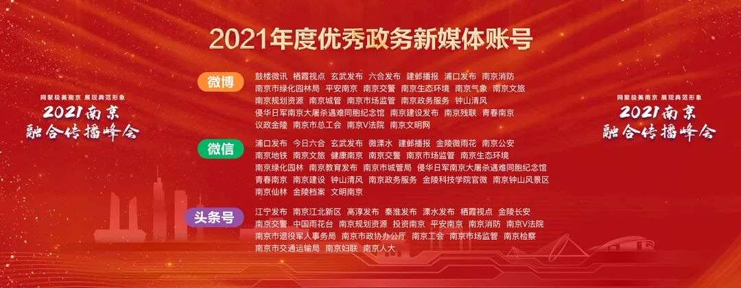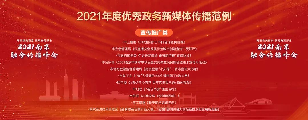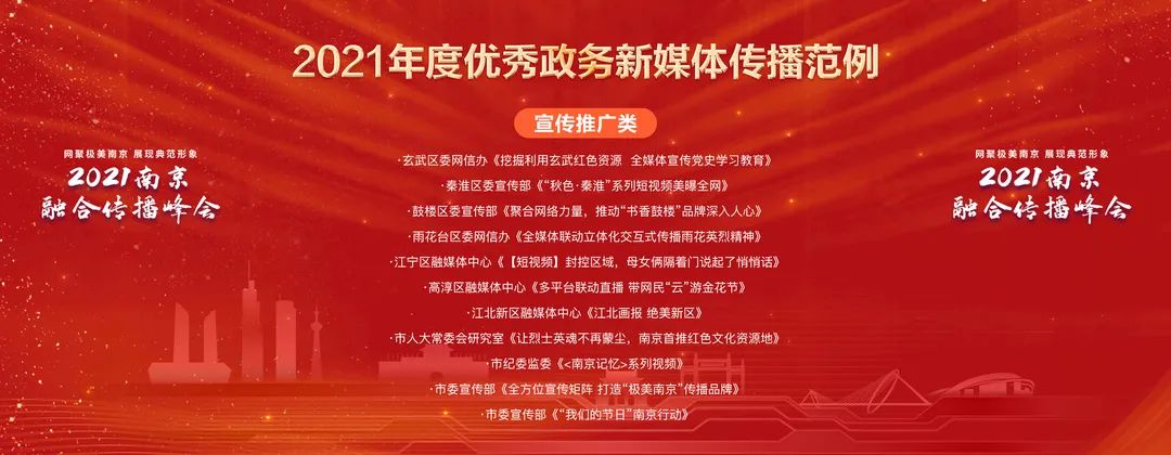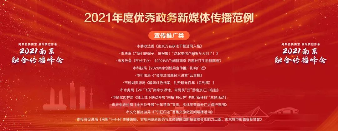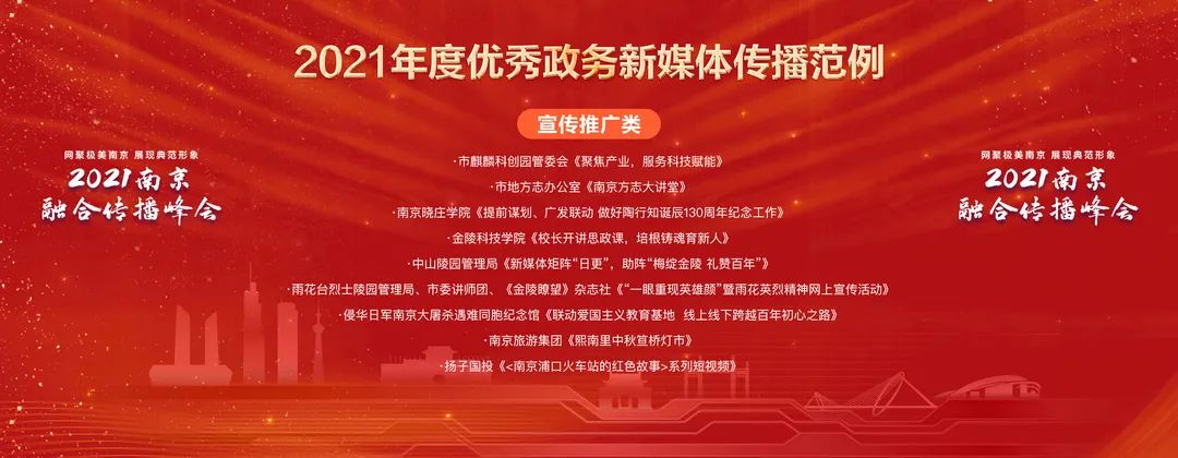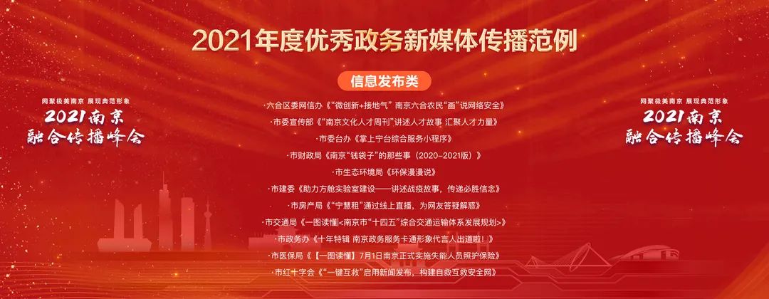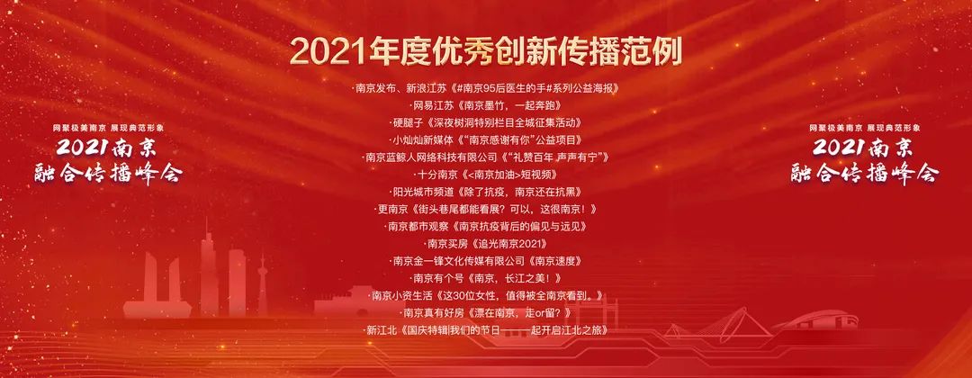 峰会现场颁发了本年度的优秀政务新媒体账号、优秀政务新媒体传播范例、优秀融合传播范例、优秀创新传播范例,“2021南京网友节”优秀项目和优秀组织以及“网聚宁新”融媒先锋展示大赛、全市重大主题网络传播优秀单位和优秀个人、2021年度“极美南京”影像传播优秀社会自媒体账号等多项大奖。