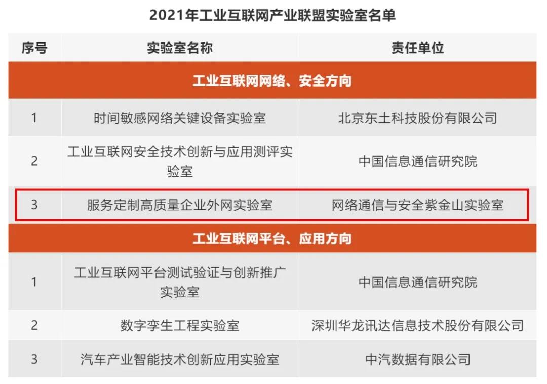 2月11日,工业互联网产业联盟对外公示2021年工业互联网产业联盟实验室名单,由紫金山实验室作为责任单位申报的“服务定制高质量企业外网实验室”成功上榜,全国仅6家入选。