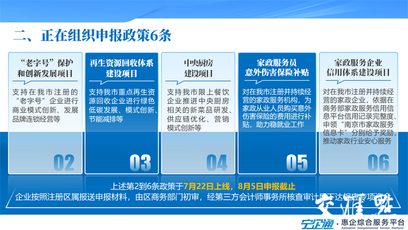 南京市要求,惠企政策在“宁企通”平台“应上尽上、一站发布”。“惠企政策直达企业行”活动,专门安排科技、工信、商务、市场监管、贸促会等部门介绍政策,提示企业及时通过“宁企通”平台申报。