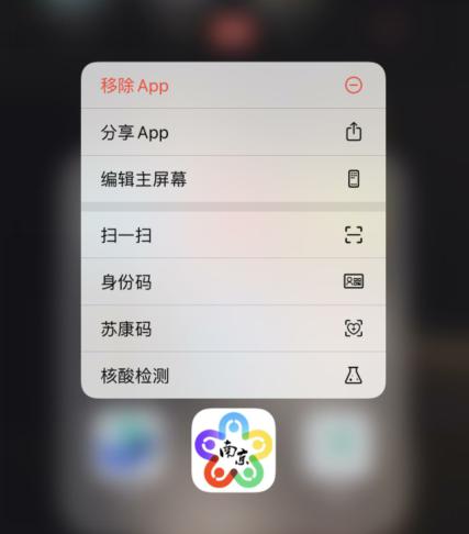 现代快报讯(记者 王益)做核酸、出入公共场所、查核酸报告 …… 作为南京市民日常使用频率最高的一款 App,7 月 28 日晚," 我的南京 " 再次更新,优化了众多实用功能。29 日一早,很多市民已经用上了最新版。其中最亮眼也最实用的一个更新是,在手机主屏幕上长按 App 图标,就可以弹出扫一扫、身份码、苏康码、核酸检测这 4 个功能,一步直达对应页面。