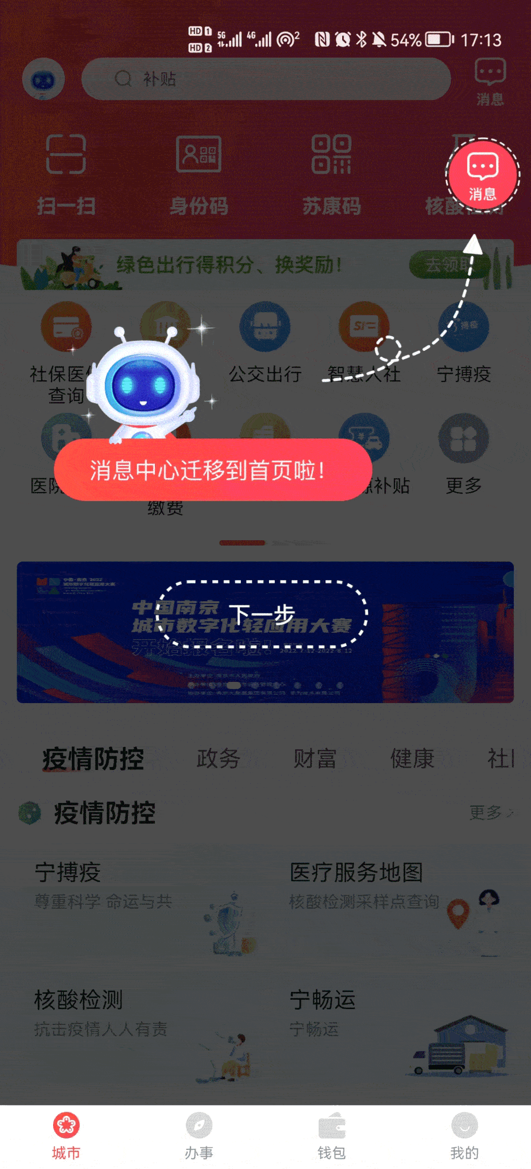 除此之外,点进 App 后,主界面也进行了优化,更加清晰。首页首栏就是扫一扫、身份码、苏康码、核酸检测这 4 项高频服务功能,图标相比之下也更大更醒目,一眼就能看到。另外,首页还新增了功能分类导航,有 " 疫情防控 "" 政务 "" 财富 "" 健康 " 等分类标签,根据置顶导航类别,可以快速定位,查找更方便。