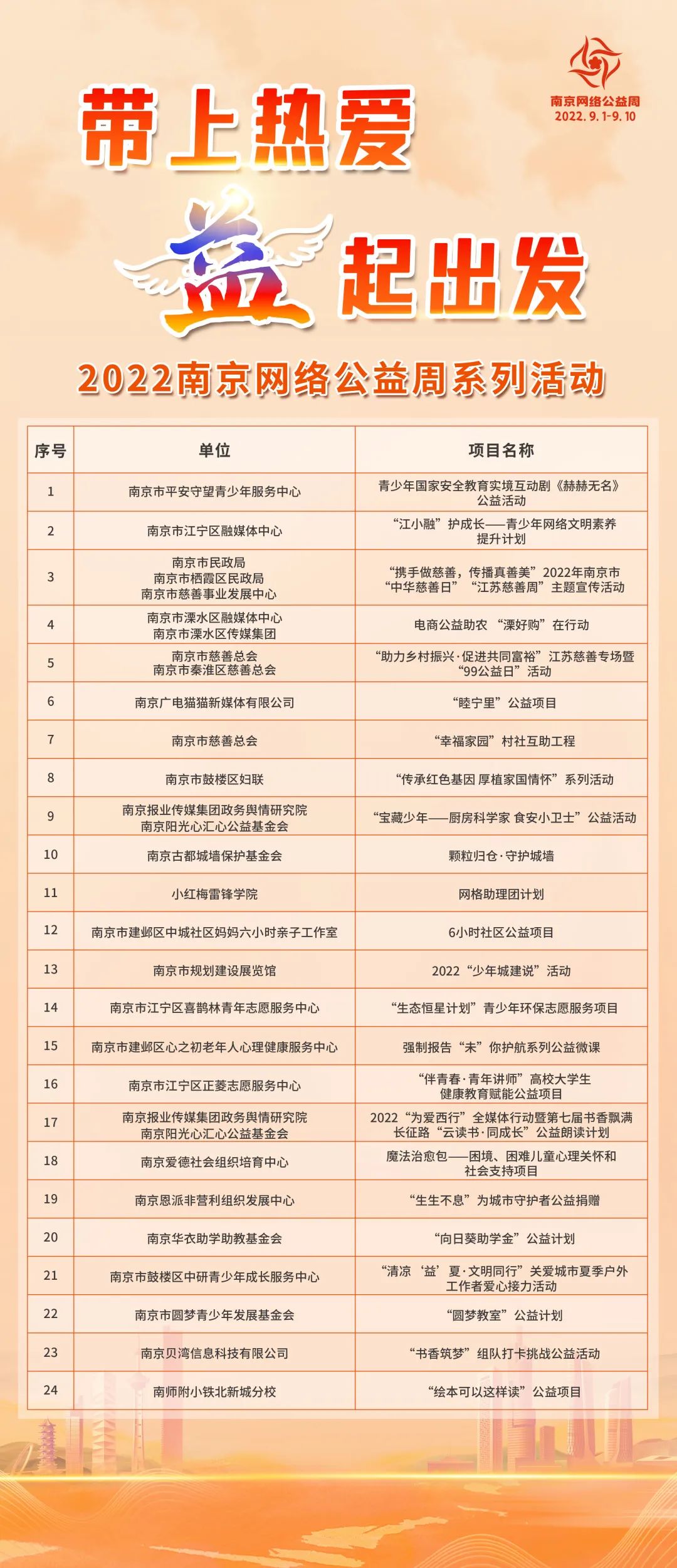 为深入学习贯彻习近平总书记关于网络文明建设的重要论述,进一步贯彻落实全国网络文明大会精神,推动南京网络文明建设向纵深发展,“宁心弘扬时代新风 聚力建设网络文明”2022南京网络文明大会于9月1日在宁举办,会上同步启动2022南京网络公益周。