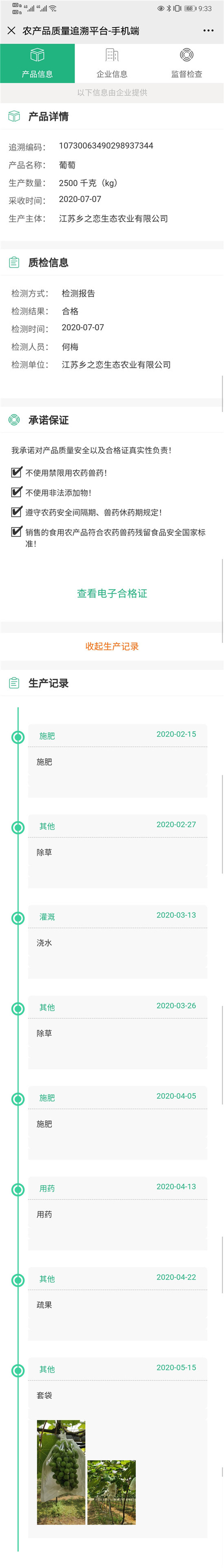 吴亮亮口中的合格证就是一个二维码,通过扫描这个二维码,顾客可以了解农产品从种到摘的所有信息。记者扫描刚刚生成的二维码,上面显示了产品的施肥时间、除草时间、用药记录以及农药残留检测报告、承诺等。