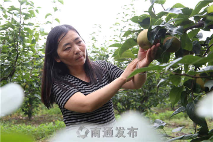 果农有顾虑,缪纯芳一方面邀请专家来“讲学”,另一方面组织果农代表外出“游学”,双管齐下,终于得到了部分果农的认可。2013年,如东金沙滩果蔬专业合作社成立,20多个果农入社,同意在原先的梨树上通过高枝嫁接的方式更换新品种,打开了改良品种的良好开端。