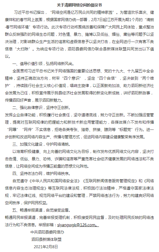 2月9日,泗阳县委网信办组织网络文明志愿者走进新时代文明实践中心、行政服务中心、档案馆和银行等场所开展宣传活动,同时在网上组织推送“清朗网络空间 你我共同守护”倡议书,积极营造清朗有序、健康祥和的春节网络氛围。宿迁市湖滨新区还把网络举报宣传工作作为该区党员冬训内容,后续将持续加大宣传力度,鼓励网友积极参与到不良信息的监督举报中来。