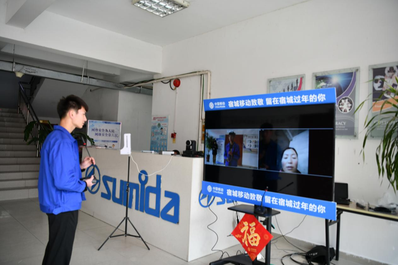 “新年好,妈,今年不能回家看您了,在这里给您拜个早年!”“家里好着呢,你在那边照顾好自己,多买些好吃的。”“放心吧,妈,今天政府来公司慰问,带来好多慰问品呢,今年公司过年福利也很好......”宿迁市宿城区埠子镇胜美达电子有限公司门前,人头躜动,欢声笑语,来自河南商丘的小伙桑帅在活动现场,与家人视频连线,隔空祝福,心情激动不已。