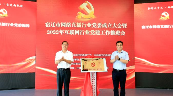 市委组织部副部长、党建办主任胡赣江;市委网信办主任,兼市委宣传部副部长、市互联网行业党委书记朱瑞军共同为宿迁市网络直播行业党委揭牌