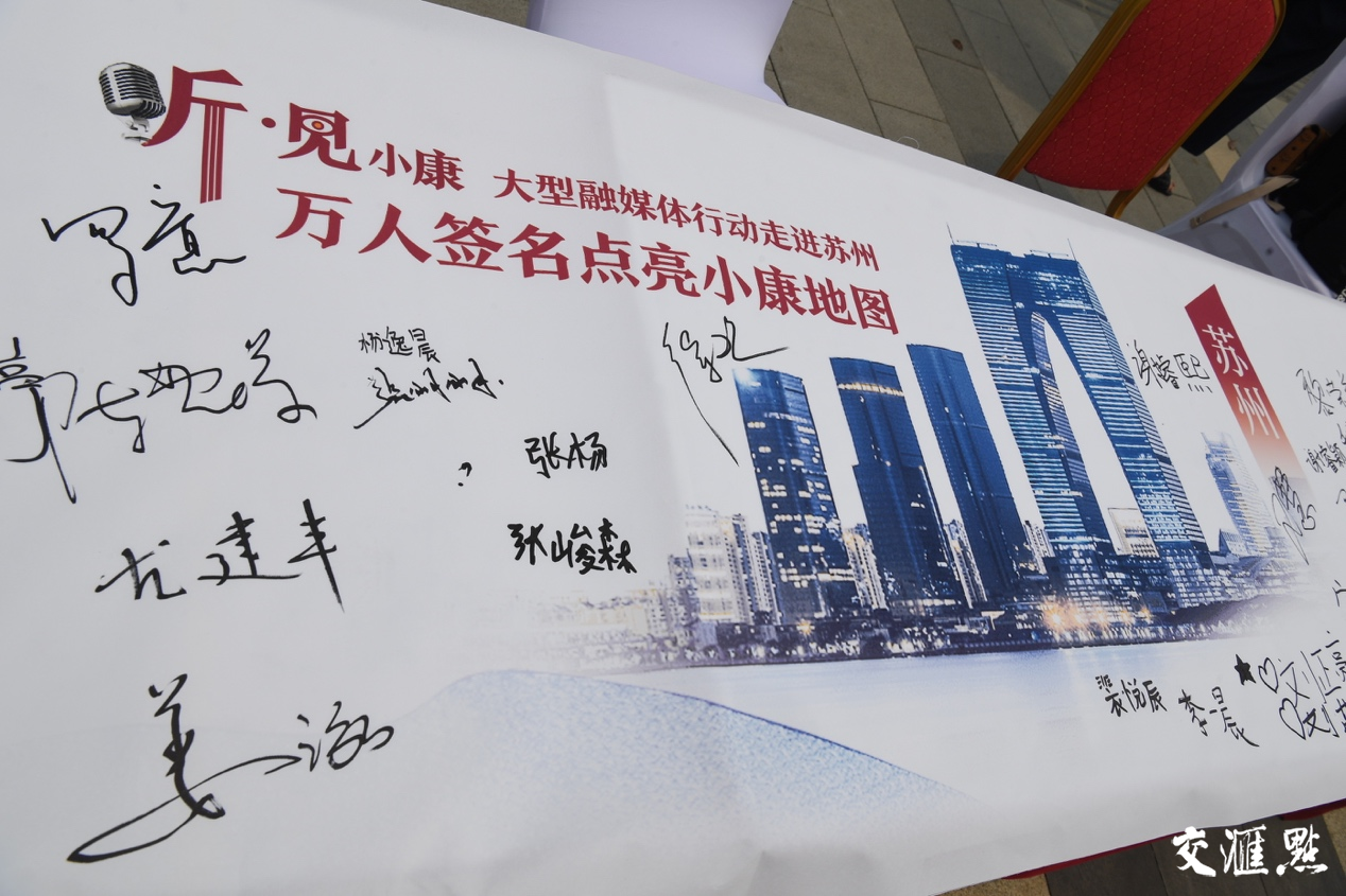 当天,嘉宾和市民也纷纷在一幅30米“小康长卷”上签名,留下小康心愿,为“万人签名·点亮小康地图”活动助力。这张寄托美好心愿的长卷,跟随“听·见小康”大型融媒体行动,从首场线下活动举办地南京来到了“人间天堂”苏州。随着该活动在江苏十三市的陆续推进,“小康签名长卷”还将走遍江苏大地。本次活动还设置了互动体验区,包括“小康幸福车”“小康留声机”“小康照相馆”“小康打印机”“小康笑脸墙”等区域,引来众多市民“打卡”参与,用“小康留声机”诉说心声,在“小康照相馆”记录笑脸,参与者还领取了内含自己小康笑脸的“‘听·见小康’特刊”作为活动留念。