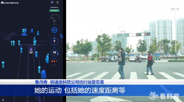 初速度科技公司出行运营总监曹丹青介绍,在实时显示的图案中,中间的白色车辆是自车所在的位置,带有小球的圆柱体图案为车辆感知到的行人,而立方体则代表行进中的车辆。实时显示的行人速度、距离等也都非常准确。