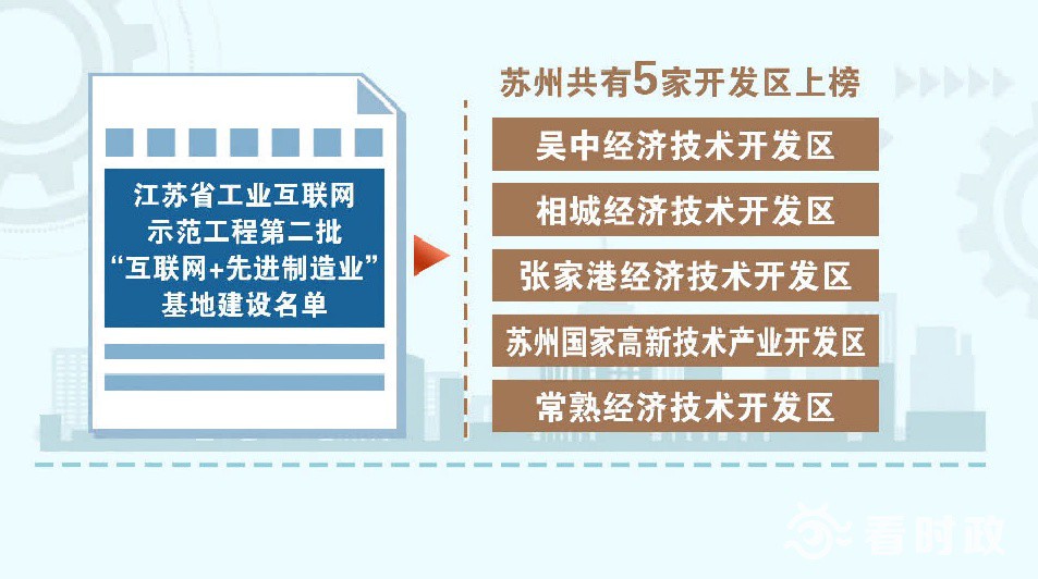 在最新公布的江苏省工业互联网示范工程第二批“互联网+先进制造业”基地建设名单中,苏州共有5家开发区上榜,分别是吴中经济技术开发区、相城经济技术开发区、张家港经济技术开发区、苏州国家高新技术产业开发区和常熟经济技术开发区。截至目前,苏州共有7个“互联网+先进制造业”基地,全面助力制造业智能化改造和数字化转型。