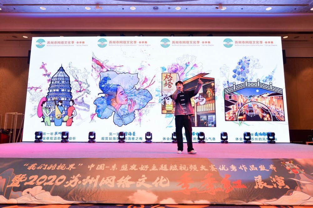 在“我们的视界”中国—东盟友好主题短视频大赛优秀作品发布后,还进行了2020苏州网络文化季季红展演。值得一提的是,主办方创新运用了rap进行网感与正能量并举的歌唱表演,再现了网络文化盛宴。