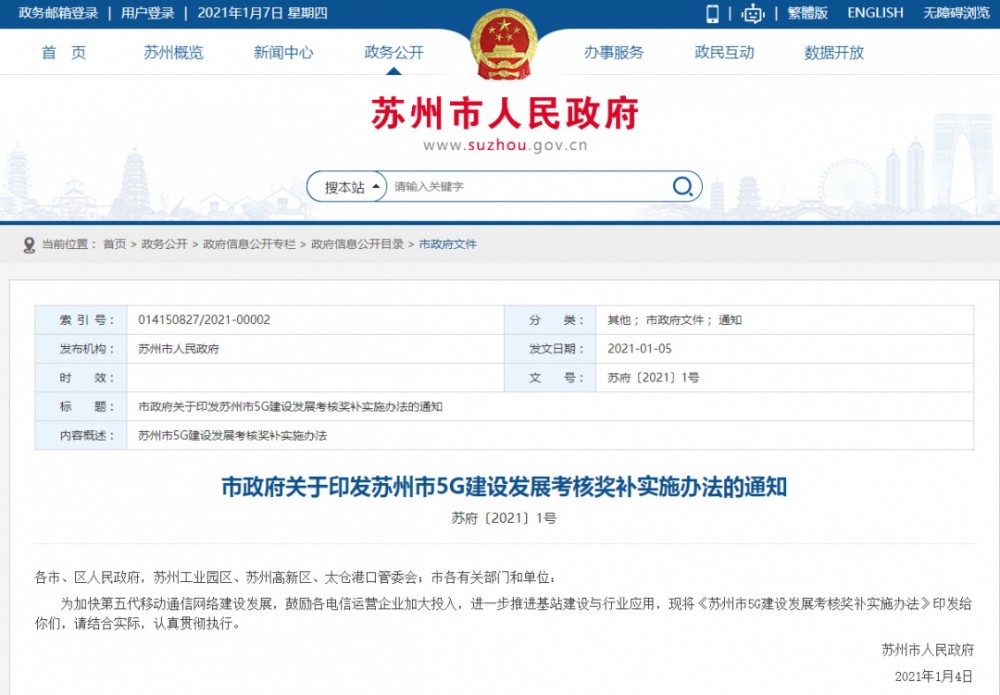 近日,苏州市政府印发《苏州市5G建设发展考核奖补实施办法》。