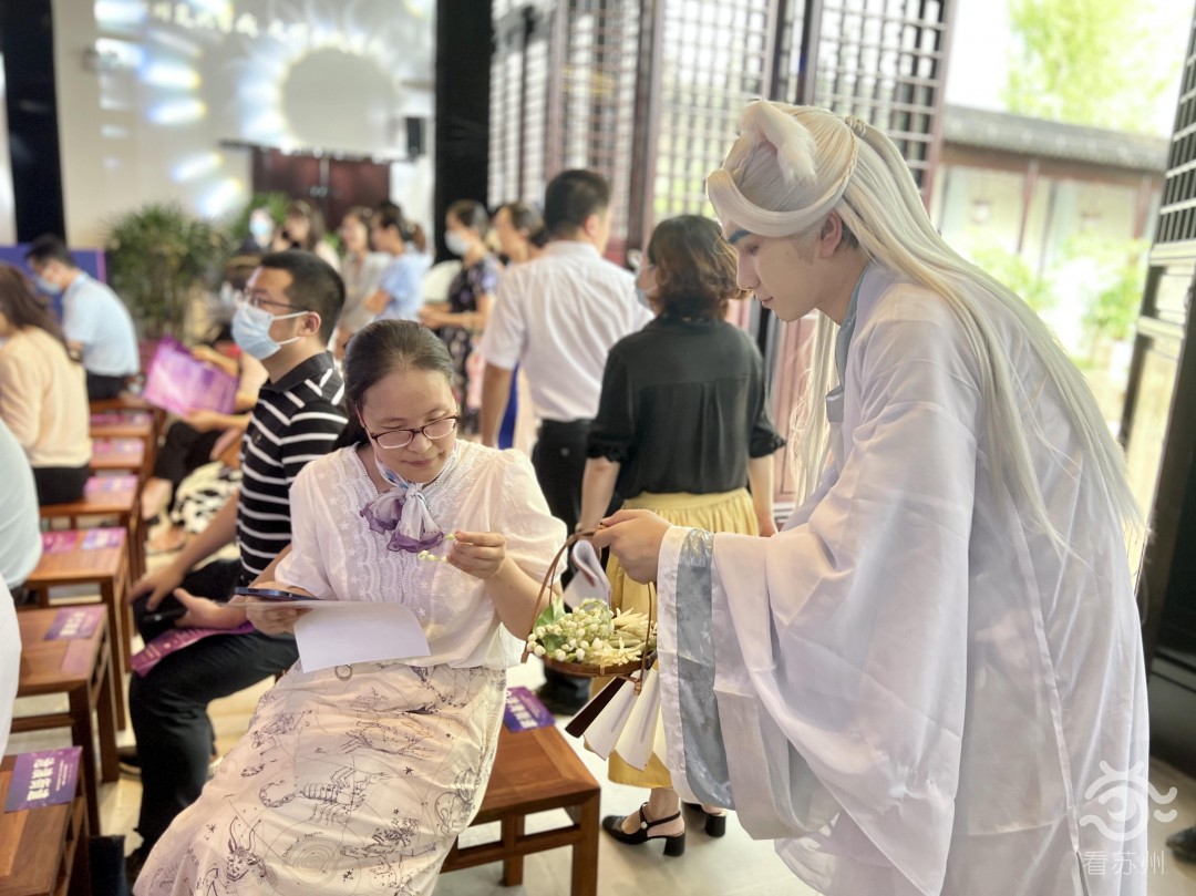 来到开幕式现场,7名汉服达人身穿华服,cosplay成姑苏七狸的形象,贯穿于整场活动中。或指引宾客入座,或为宾客奉上香气浓郁的玉兰花手链,让人仿佛置身江南水墨画中,姑苏韵味浓厚。