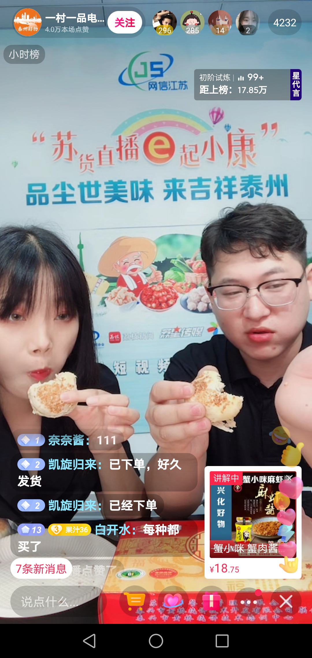来,来,来,家人们一起嗨起来~~~7月30日下午4:30,泰州特色绿优美食担当主角, “苏货直播 e起小康”泰州专场大型网络公益活动火热开播,一村一品90后主播团队进驻直播间。网红现场直播带货,网友热情互动秒杀,品鉴泰州“味道”中传递美食文化,推进本土企业复工达产,助力乡村振兴繁荣。