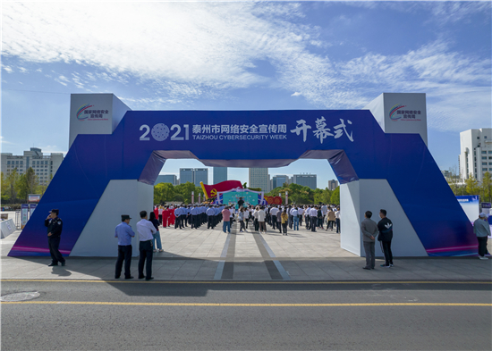 开幕式现场,泰州市“1+6”网络安全素养教育打卡地标、2021年泰州市网络安全优秀实践案例发布,江苏省网络安全知识竞赛获奖代表接受表彰,防范电信网络诈骗倡议书公布,网络安全知识技能宣传开展。(文 张小燕 李骏骅)