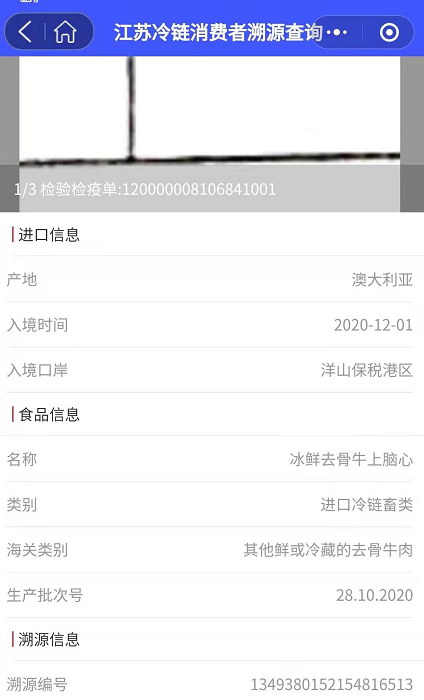产地:澳大利亚;入境时间:2020.12.1;入境口岸:洋山保税港区;名称:冰鲜去骨牛上脑心;生产批次号:28.10.2020……16日,无锡市民陈先生在太湖新城一家进口超市内购买冷冻食品时,用手机扫了下柜台上公示的二维码,很快,食品从哪里来、生产日期、批次等信息都显示得清清楚楚。从无锡市市场监管部门了解到,无锡市引入信息化监管手段,强化生产监管, 筑牢进口冷链食品安全“防火墙”。