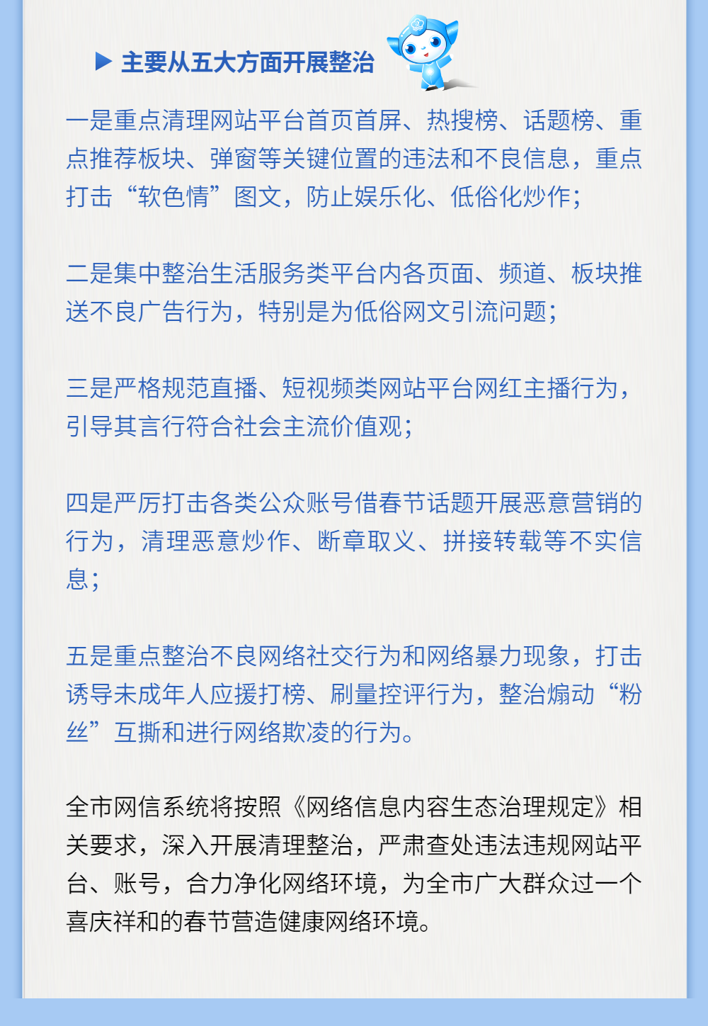 为营造欢乐喜庆、健康祥和的春节网上氛围,根据上级统一部署,即日起无锡市委网信办开展为期1个月的“清朗·春节网络环境”专项行动。