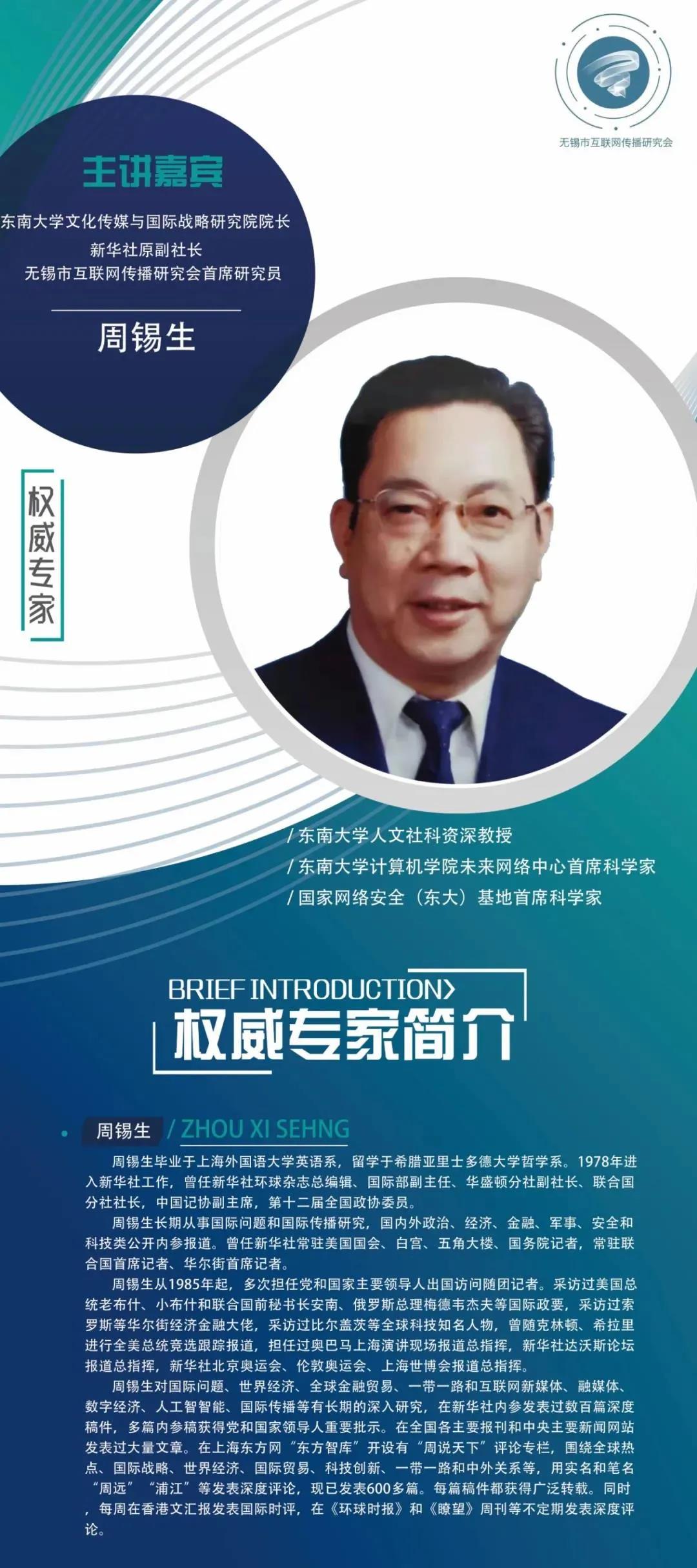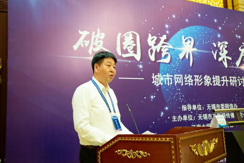 东南大学文化传媒与国际战略研究院院长、新华社原副社长、无锡市互联网传播研究会首席研究员周锡生以《国际传播视野下的无锡网络城市形象传播》进行主旨演讲。
