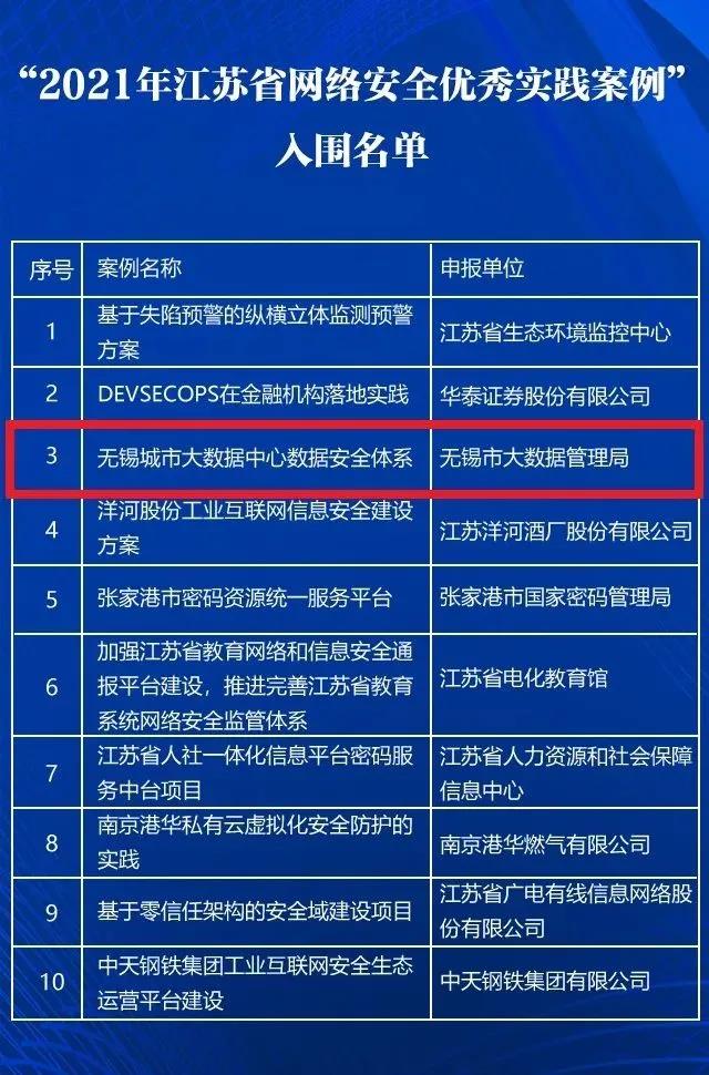 除锡盾平台外,市公安局、市卫健委、市大数据局等部门在各自行业领域开展网络安全体系建设。目前,无锡市公安网络安全综合防控体系信息平台、无锡市卫生健康委数据中心、无锡城市大数据中心安全体系等已建设完成。其中,“无锡城市大数据中心安全体系建设项目”入选“2021年江苏省网络安全优秀实践案例”。