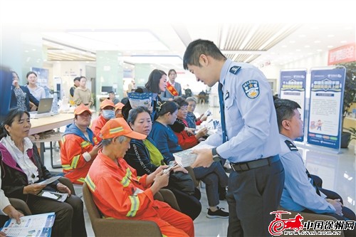 市反诈中心干警在发放反诈宣传资料。 受访单位供图
