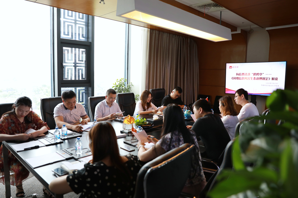 7月17日下午,盐城市委网信办在属地商业网站鹤鸣亭举办《网络信息内容生态治理规定》专题辅导,鹤鸣亭全体中层以上干部参加。