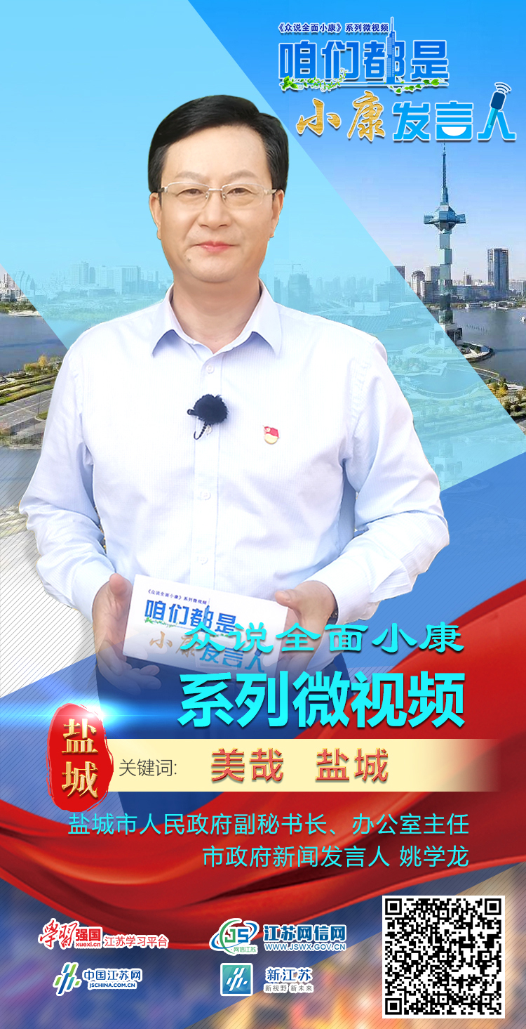 10月30日,《盐城:美哉 盐城》微视频正式上线。本期微视频由盐城市人民政府副秘书长、办公室主任、新闻发言人姚学龙精彩开篇,通过“城市之美”“田园之美”“生活之美”三大板块勾画出盐城人民心中的小康生活;“全国五一劳动奖章”获得者秦光蔚,农业致富带头人刘晓春、还璇,网络大V,市民代表等陆续登场,聊聊他们的“心里话”;片尾还有盐城市盐都区郭猛镇杨侍村的周叶夫妇以vlog形式讲述他们的回乡创业之路。