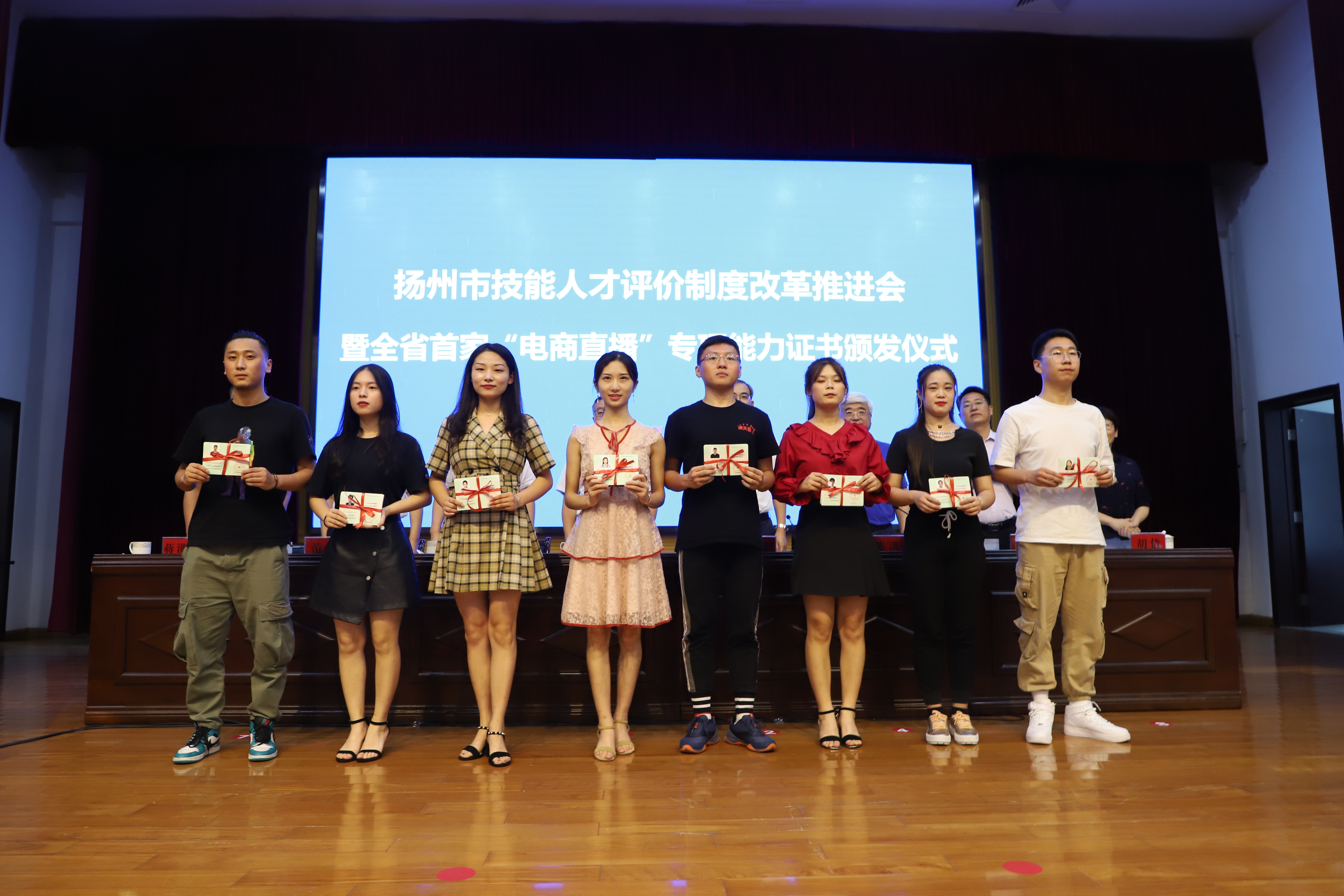 “吃葡萄容易,洗葡萄难,大家是不是和我有一样的烦恼,来看看这个篮子……”在扬州工业职业技术学院电商直播学院的直播教室里,参加江苏省首批电商直播专项职业能力考核的主播们正在进行直播实操考试。8月13日,扬州市技能人才评价改革推进会暨江苏首家“电商直播”专项能力证书颁发仪式在扬州工业职业技术学院举行,江苏首批26名主播拿到了扬州市人社局颁发的“电商直播专项职业能力证书”。