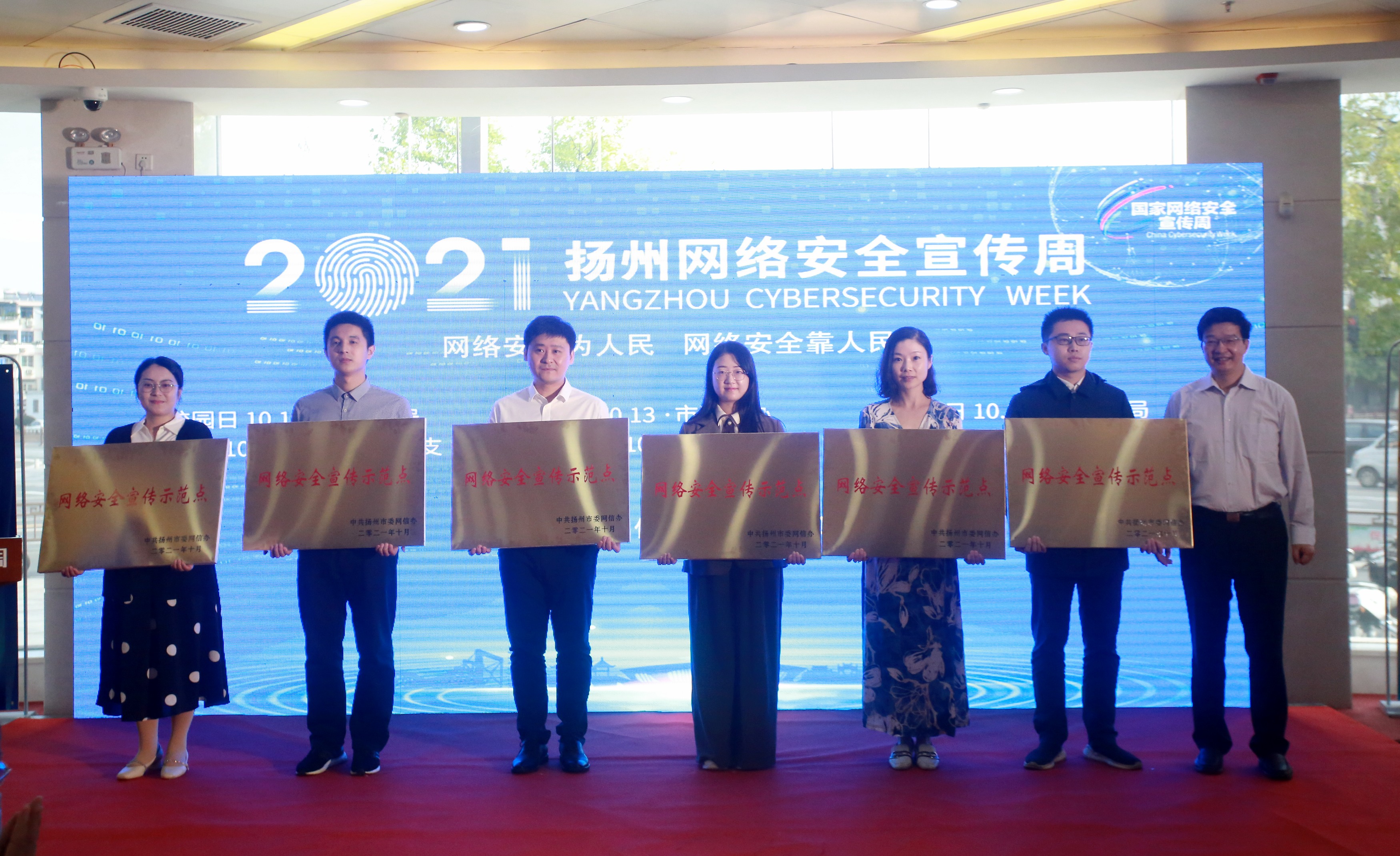 开幕式上,余珽副市长为扬州工行营业部、焦巷村、蒋王社区、花都汇互联网公园、一束光城市书房、公交巴士等6家网络安全宣传示范点授牌。人民银行扬州中心支行行长何敏代表主题日承办单位发言。余珽、殷元松、何敏、市工商银行行长苏伟共同启动2021年扬州网络安全宣传周。