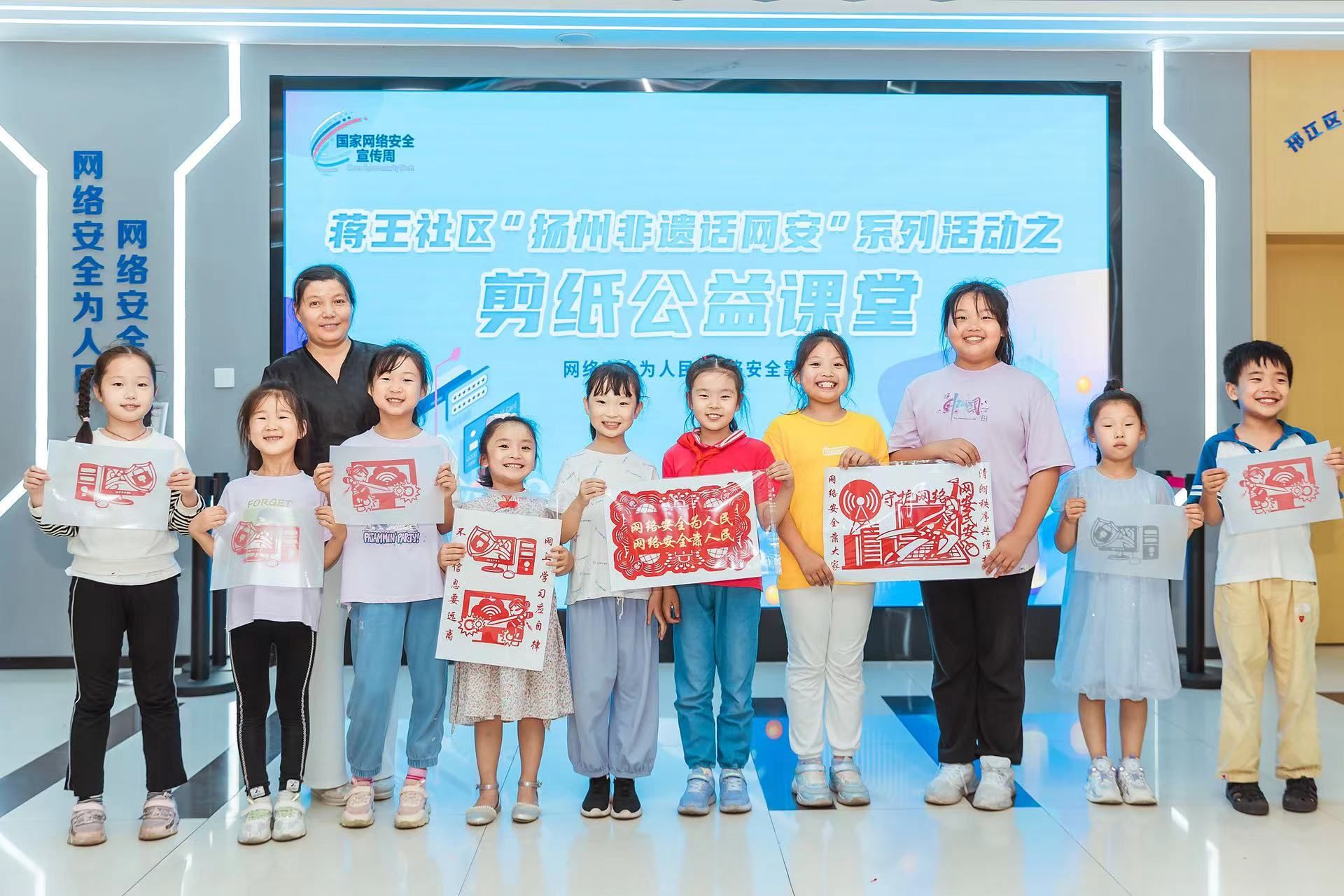 指尖翻转跳跃间,一幅幅栩栩如生、形象生动的宣传网络安全剪纸作品就呈现在大家面前。9月7日晚间,一堂以“非遗话网安”的剪纸公益课堂在邗江区蒋王街道蒋王社区举办,扬州市工艺美术大师赵红妹正手把手教孩子们制作网络安全剪纸作品,以此提高青少年网络法治意识,提升青少年网络文明素养。