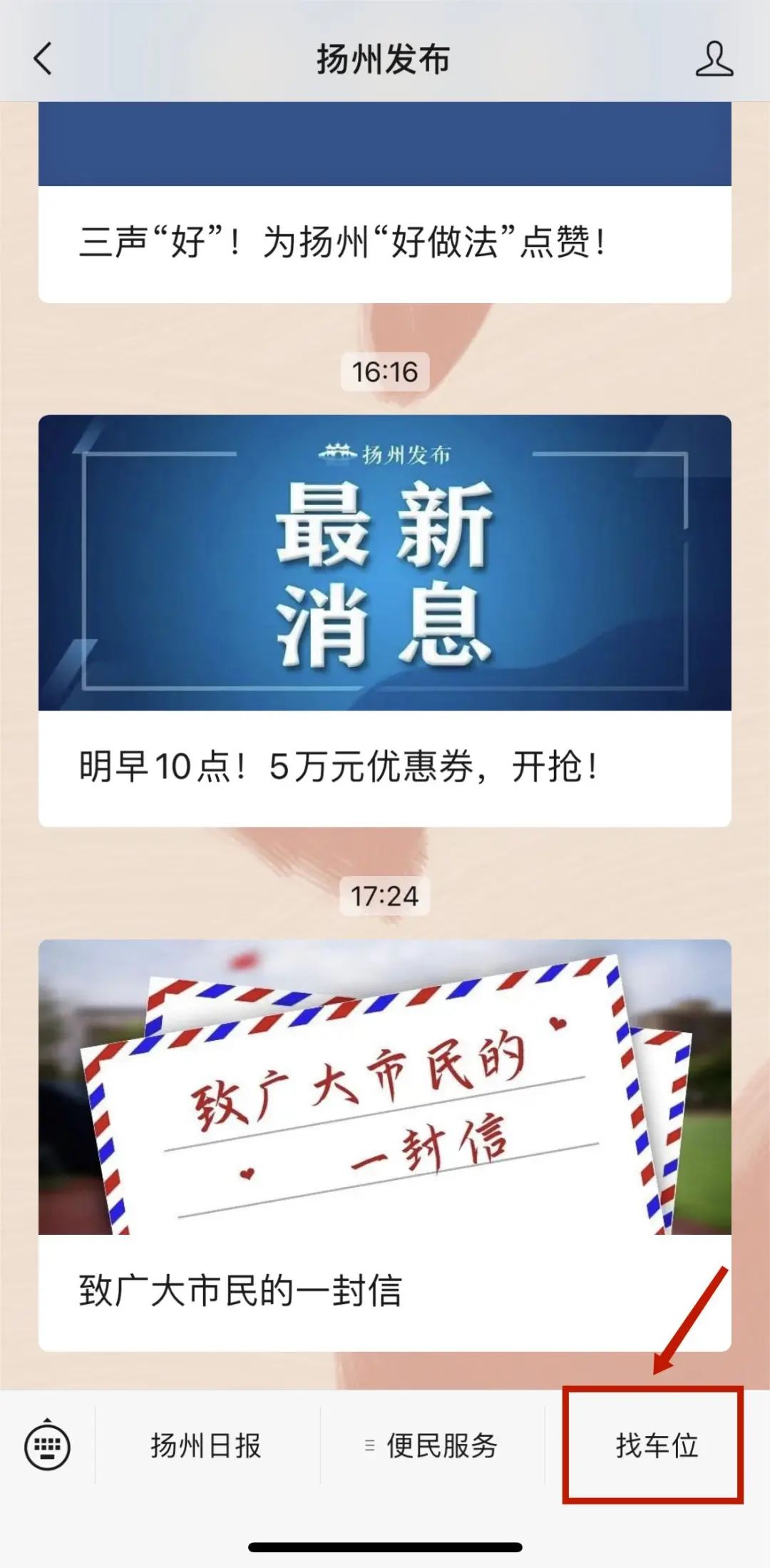 方法二:关注“扬州发布”微信公众号,点击菜单栏“找车位”或发送消息“找车位”,进入页面。