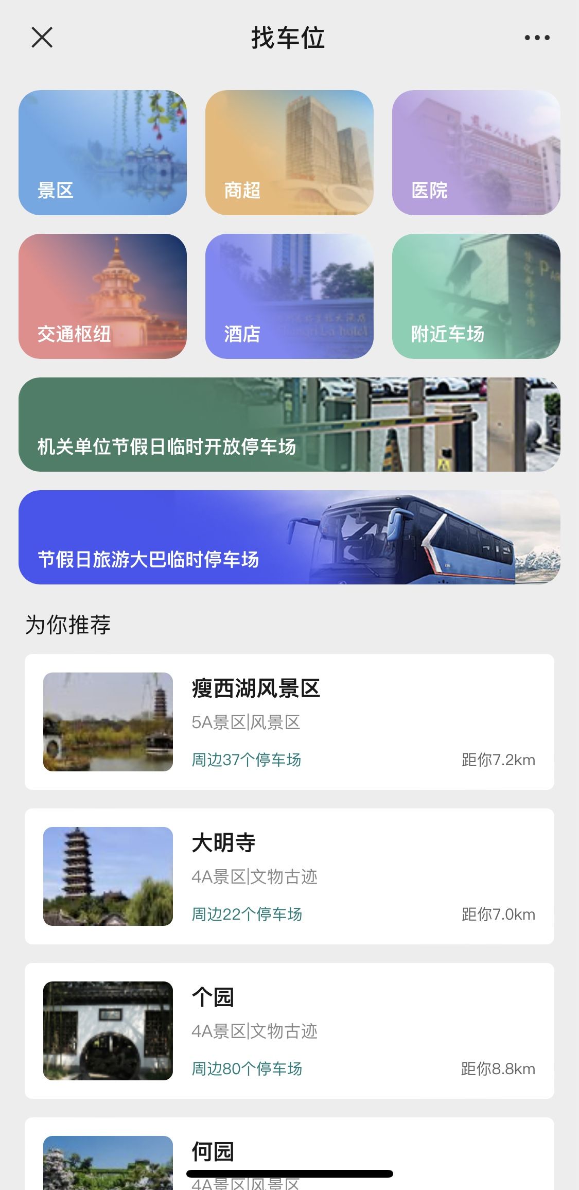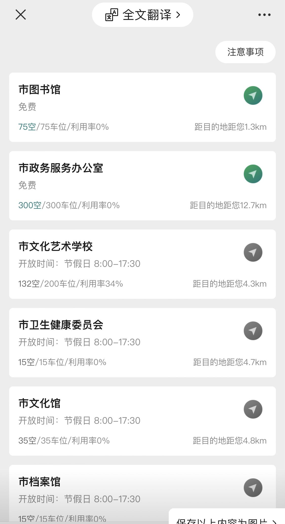 页面除景区、商超、医院、交通枢纽、酒店等板块外,还专设“机关单位节假日临时开放停车场”板块,非常醒目。点击“机关单位节假日临时开放停车场”,可以看到,市图书馆、市政务服务办公室、市文化艺术学校等一个个停车场信息整齐显示;根据定位信息,将开放的市级机关内部停车场由近及远显示出来。每个停车场都注明有多少个空位、多少个车位、利用率等,并标注出距目的地的距离。点击导航按钮,便可进入地图,显示路线。