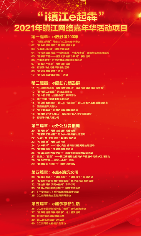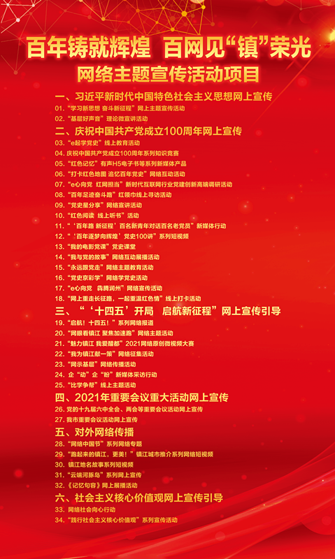 庆祝中国共产党成立100周年网络主题宣传项目共分六大主题44个项目梯次展开、贯穿全年。网络嘉年华项目以“i镇江E起犇”为主题,分“e心致敬100年”“e同助力新发展”“e分公益爱相随”“e点e滴筑文明”“e起乐享新生活”等五大篇章。