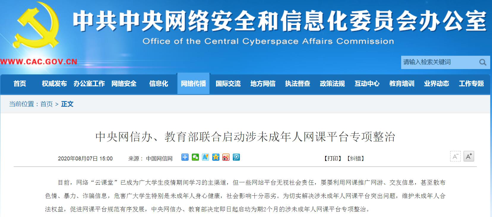 当前,在线网课教学已成为未成年人学习新时尚,特别是疫情期间“停课不停学”“互联网+教育”,让网课新业态持续呈井喷式发展,为切实保障优质线上教育资源供给,有力维护未成年人网络合法权益,推动网课平台规范有序发展,8月初,中央网信办、教育部联合启动为期2个月的涉未成年人网课平台专项整治。