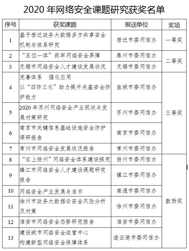 为深入贯彻落实习近平总书记网络安全“四个坚持”重要指示精神,提升江苏省网络安全综合保障能力,省委网信办组织开展网络安全课题研究活动。各设区市委网信办积极参与,围绕网络安全管理理论、人才建设、形势分析、产业发展等方面,深入开展调查研究,撰写研究报告。10月30日,省委网信办在扬州组织开展集中评比活动,邀请来自院校和省级机关相关部门的5位专家参加评比。通过课题提交、PPT汇报、专家打分、领导审定等环节,评出一、二、三等奖和鼓励奖。