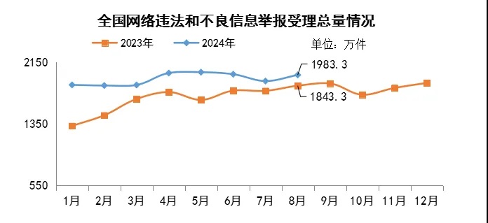 2024年8月,中央网信办举报中心指导全国各级网信举报工作部门、主要网站平台受理网民举报色情、赌博、侵权、谣言等违法和不良信息1983.3万件,环比增长4.2%、同比增长7.6%。其中,中央网信办举报中心受理举报41.5万件,环比下降2.2%、同比下降19.1%;各地网信举报工作部门受理举报117.9万件,环比增长14.5%、同比增长66.6%;全国主要网站平台受理举报1823.9万件,环比增长3.7%、同比增长6%。