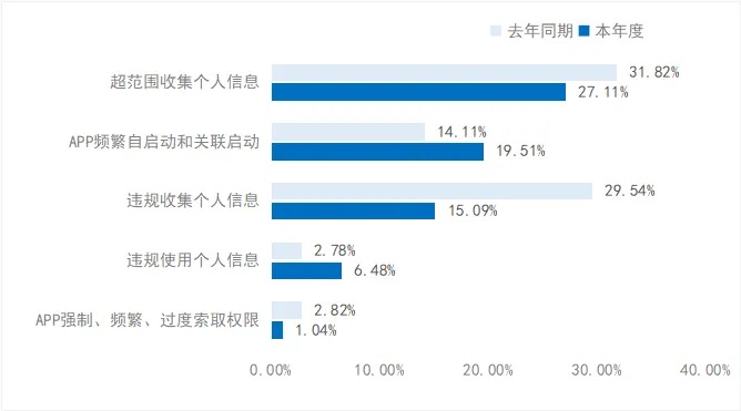 这是《移动互联网应用安全统计分析报告(2024)》中关于APP主要违规问题占比变化情况统计图表。