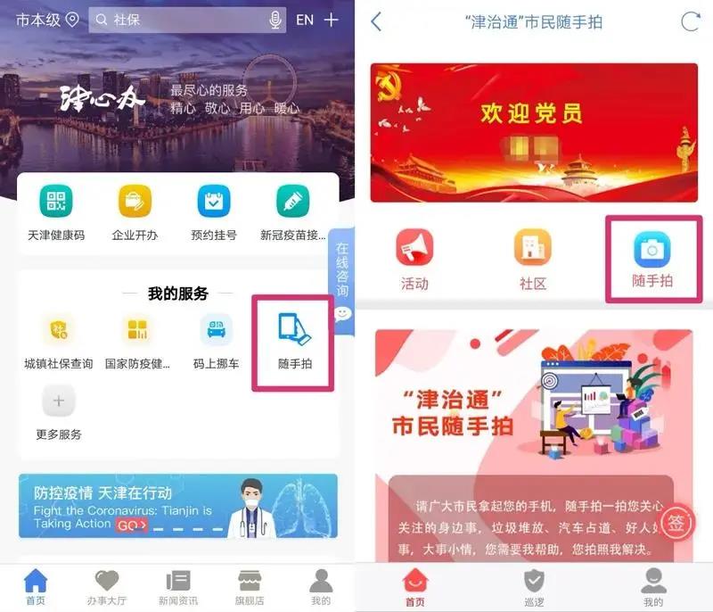 近日,“津心办”“津治通”“两津联动”全场景应用再上新,新添“市民随手拍”功能,进一步激发群众参与社会治理的活力。市民在天津市任何地方只要发现问题,就可以打开“津心办”App中的“随手拍”模块,将问题拍照定位上报,只需30秒,您关心的“这件事”即可推送至“津治通”,进入事件流转处理程序。随着“两津联动”应用场景不断丰富,政务服务“一张网”和城市治理“一张网”在“指尖”合一,驱动数据价值不断释放,赋能城市数字化转型,不断满足群众对美好生活的新期待,共建共治共享“我的城”。